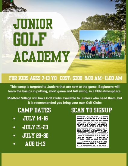 Currently our junior golf instruction camps are available to all Medford Village Country Club members as well as the general public.
